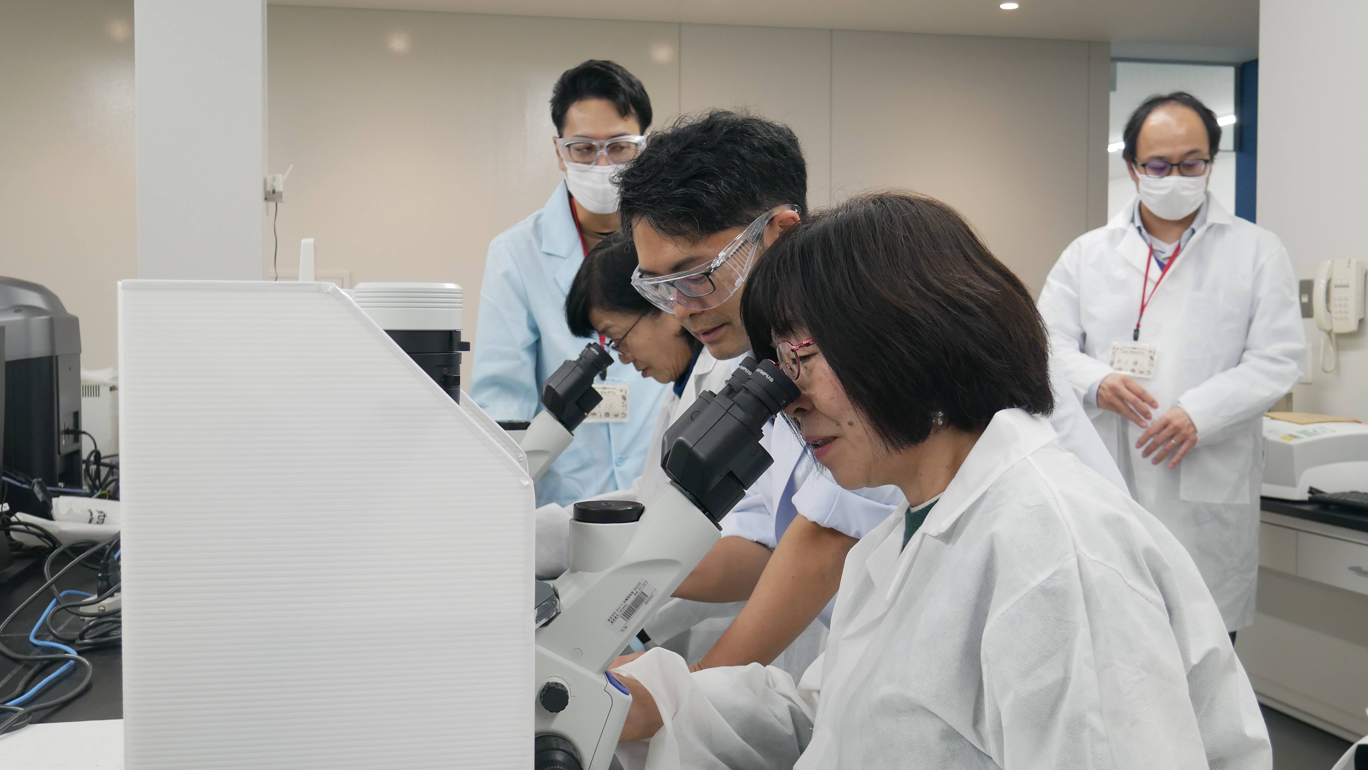 最後に、当事者様とご家族の皆さんと一緒に筑波研のラボツアーを行いました。新薬研究のプロセスなどを紹介しながら、実際に社員が研究に用いている機器や顕微鏡を試していただきました。