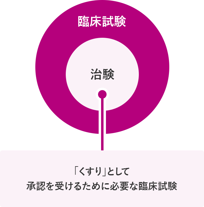 人での効果や安全性について調べる試験を「臨床試験」といいます。このうち「くすり」として承認を受けるために行う臨床試験のことを「治験」といい、治験に使用する「くすりの候補」を「治験薬」といいます。