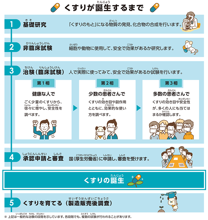 そして治験で得られた結果は、厚生労働省から「くすり」として承認を受けるために審査されます。新薬の基礎研究から「くすり」の誕生まで、10年以上の年月を要することもあります。