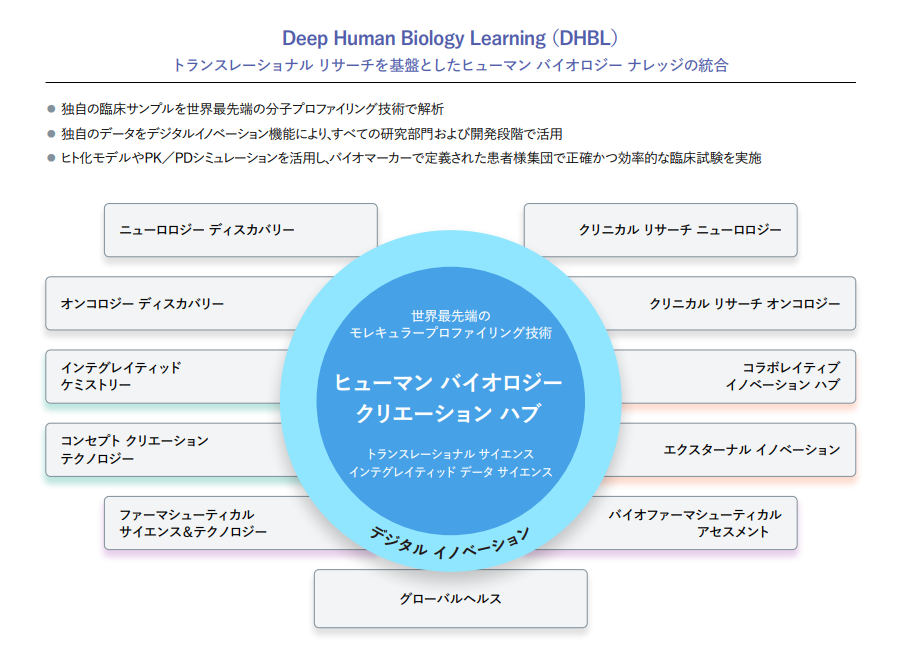 バイオロジー、情報およびデジタルなどの技術の進化により、疾患が発症する前の健常段階における生体内の変化が解明され、疾患概念が変わりつつあります。このような変革の中で、疾患の状態を正しく把握し、治療法を創出するには、その発症や進行だけを理解しようとするのではなく、疾患を連続体(Disease Continuum)として捉え、根本原因に紐づくゲノム情報や、細胞のメカニズム、病態生理といった生体内の生物学的な変化(Human Biology)を深く理解することが重要です。そこで、2022年7月より当社独自のユニークな臨床データを起点とするHuman Biologyに基づく創薬アプローチへの転換を企図し、DHBL(Deep Human Biology Learning)体制へと研究開発体制を刷新しました。
