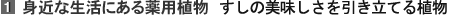 口休め、口直しとしてすし屋さんで欠かすことができないガリと呼ばれる生姜、シャリ(酢飯)とネタ(魚介類などの具材)の間に入れて味を引き立てるサビと呼ばれる山葵には、防腐や殺菌、食欲増進などの効果があります。無くては味気ないもの、すしを美味しくいただくために欠かすことができない薬草です。