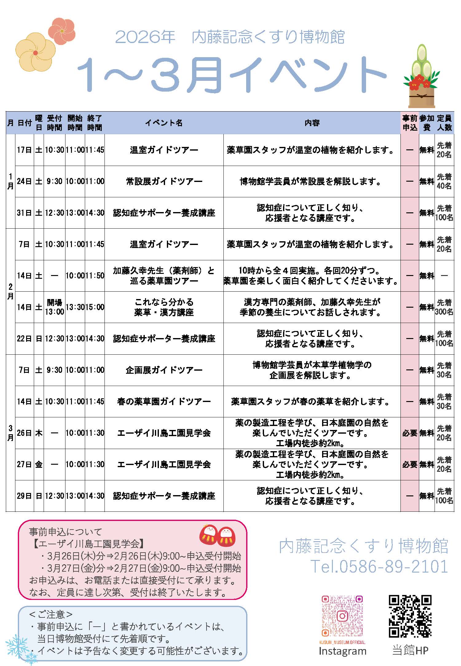 2025/12/16 イベントのお知らせ(2026年1〜3月) みなさまいかがお過ごしでしょうか? 2026年1〜3月に内藤記念くすり博物館で開催するイベントをご紹介します。 様々なガイドツアーや大人気の加藤久幸先生の講演会、エーザイ川島工園見学会などが行われます。 また、3月7日(土)に行われる、企画展「本草学から植物学・創薬への広がり」のガイドツアーにも注目です! 今回の企画展は、2026年3月31日(火)で終了となります。残り約3か月ですので是非お見逃しなく! ※事前申し込みが必要なイベントについては、各開催日の1ヶ月前から申込を開始し、定員に達し次第締め切ります。参加をご希望の方は、くすり博物館にお電話をいただくか受付にお申し付けください。 何卒よろしくお願い申し上げます。