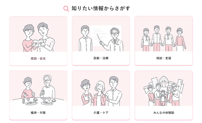 認知症情報サイト「相談e–65.net(そうだんイーロゴ・ネット)」では、認知症の種類や原因、病院に行く前に知っておきたい診断・治療に関する情報、認知症に関わる方を支えるための支援制度や相談先、認知機能の維持・向上の対策、介護方法、体験談など、認知症と歩む皆様に向けた情報を掲載しています。また、認知症に関する相談や治療に対応している医療機関を検索いただける「認知症相談ナビ」のほかに、体と脳を活性化するデュアルタスクの運動プログラム「ブレパサイズ」も掲載しています。