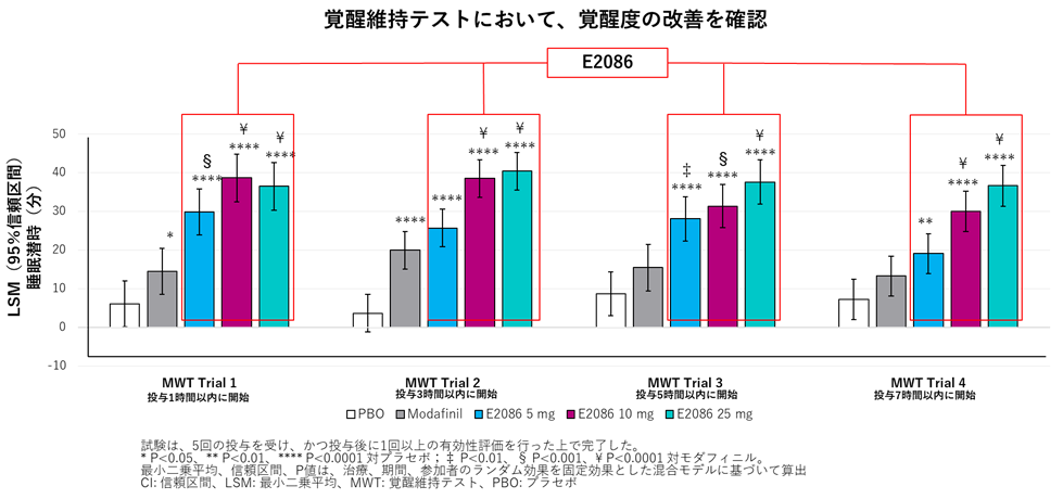 MWTにおいて、E2086の全ての用量において、プラセボおよびモダフィニルと比較して、覚醒を維持する能力を測定する指標である睡眠潜時*3の統計学的に有意な延長が認められました(プラセボに対しては全用量でP<0.0001、モダフィニルに対してはE2086 5 mg: P=0.0009、E2086 10 mgおよび25 mg: P<0.0001)(下図)。また、改訂版KSSにおいても、E2086は全ての用量において、プラセボと比較して統計学的に有意な改善を示し(P<0.0001)、E2086 10mgおよび25 mgは、モダフィニルとの比較においても統計学的に有意な改善を示しました(P<0.0001)。これらの結果によりE2086のProof of Mechanismが確認されました。