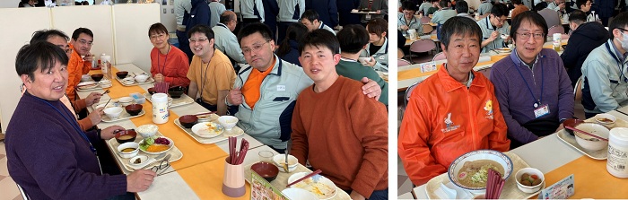 川島工園では、オレンジ色のテーブルクロスが食堂を華やかな雰囲気に彩りました。シンボルカラーの服装やアイテムを身に着けた社員が交流しながら食事を楽しみ、NTDsへの理解を深めました。