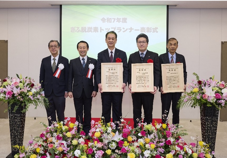 「ぎふ脱炭素トップランナー表彰」は、岐阜県が県内の事業活動に伴う温室効果ガスの排出抑制を推進するために今年度より新たに創設した表彰制度です。岐阜県が、県内の特定事業者に対し、温室効果ガスの排出削減計画書および実績報告書の提出を求め、評価を実施し、特に優れた取り組みの事業者を表彰するものです。2月20日に岐阜県庁にて表彰式が開催されました。
