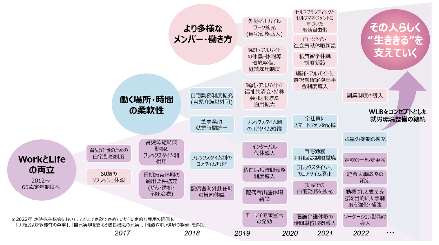 当社は、過去より健全な労使関係に基づいた労使協議を積み重ね、様々な就労環境を整備してきました。特に日本国内においては、会社の現況について労使で共通認識に立つべく、社の業容や決算概要、中期的な見通し等に関する労使協議も定期的に開催しています。また、社員一人ひとりがWLBを実感していくためには、労使のディスカッションだけでなく、リモートやリアルといった様々な環境下における社員間でのコミュニケーションやコラボレーションを誘発する仕組みも重要です。現在、人財情報を可視化して共働や共創を活性化する、多様化したチームのための新たな組織開発等の強化を進めており、WLBに向けた体制・システム整備を継続的に推進しています。