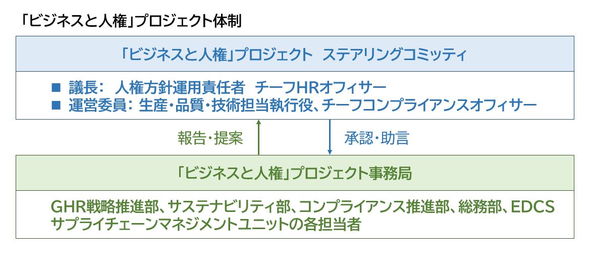 国際社会が求める人権方針に基づく人権尊重の活動実施や、人権デュ―・ デリジェンス実施を目的に、2018年に組織横断型の「ビジネスと人権」プロジェクトを設置しました。本プロジェクトは、チーフHRオフィサーを議長とし、生産・品質・技術担当執行役、チーフコンプライアンスオフィサーを運営委員とする「ビジネスと人権」プロジェクト ステアリングコミッティにより運営されています。本ステアリングコミッティは、原則年2回開催されます。事務局としてGHR戦略推進部、サステナビリティ部、コンプライアンス推進部、総務株式部、EDCSサプライチェーンマネジメントユニットの担当者が活動をリードしています。